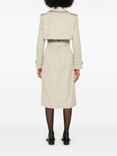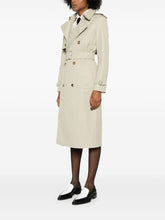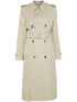 Tissage en gabardine de coton beige clair, épaulettes, rabat-tempête, col droit, manches longues, poignets ceinturés, passants de ceinture, ceinture amovible, deux poches passepoilées latérales, fente centrale à l'arrière, doublure à motif Vintage Check, patch logo interne, ourlet droit, fermeture à double boutonnage.