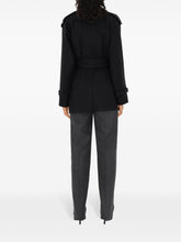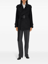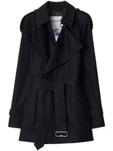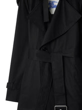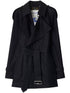 Manteau en gabardine de coton noir, doté d'un large revers cranté et d'une fermeture à double boutonnage, il présente une taille ceinturée, des manches longues avec poignets ceinturés et deux poches passepoilées latérales. La doublure en coton et l'ourlet droit offrent confort et style.