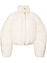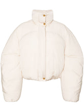 Bénéficiez d'une chaleur et d'un style luxueux avec cette veste matelassée blanc cassé dotée d'un col cheminée, d'une fermeture à boutons-pression et à glissière, ainsi que de poignets et d'un ourlet élastiqués. Les manches longues, les deux poches latérales fendues et la doublure intégrale ajoutent une touche pratique, tandis que les détails dorés lui confèrent une touche d'élégance.