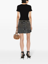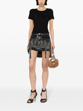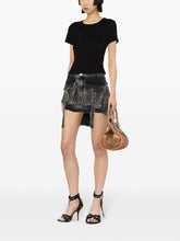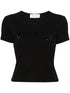 Confectionné en coton extensible de haute qualité et orné de strass scintillants, ce t-shirt en tricot côtelé noir présente un élégant logo, un col ras du cou classique, des manches courtes et un ourlet droit.
