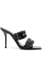 Mules à boucle d'Alexander McQueen en cuir de veau noir, avec boucle à l'orteil, semelle intérieure griffée, talon aiguille haut et bout carré.